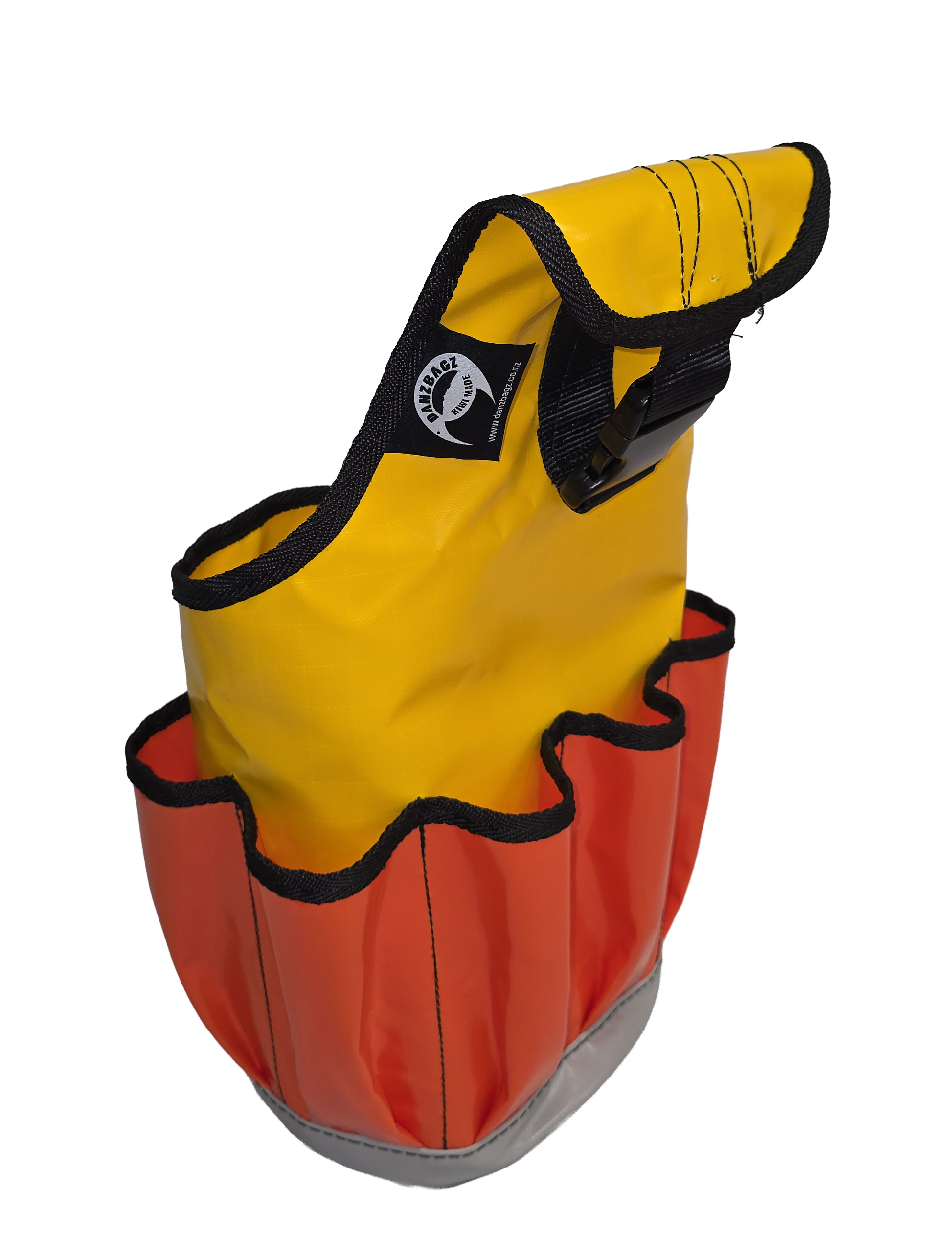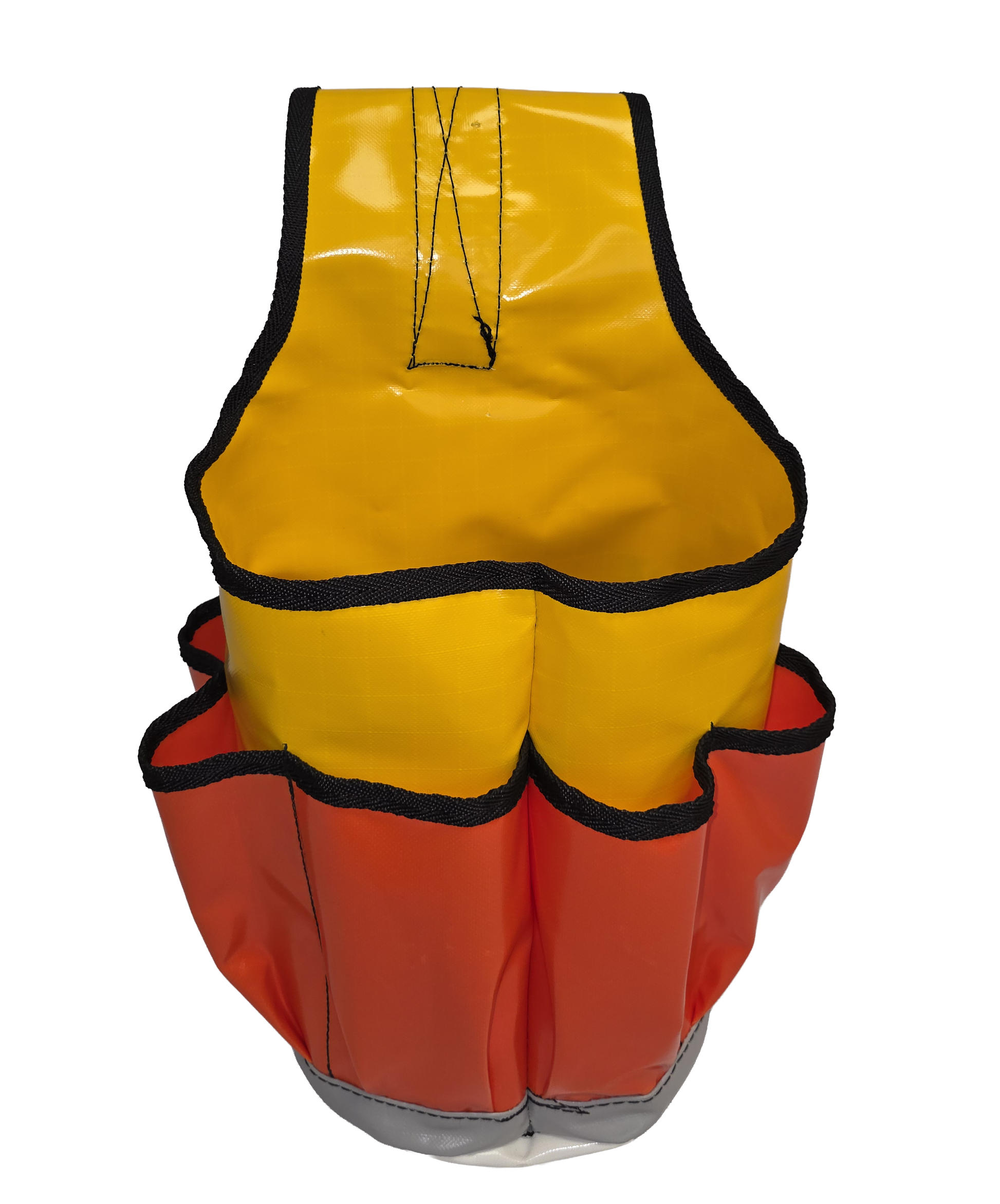 A rugged, NZ-made PVC tool bucket bag in high-visibility yellow and orange. Built with 8 exterior tool slots (190 mm deep), 8 interior tool slots (180 mm deep), and a large center compartment for multipurpose storage. Features a heavy-duty clip to secure onto your belt.